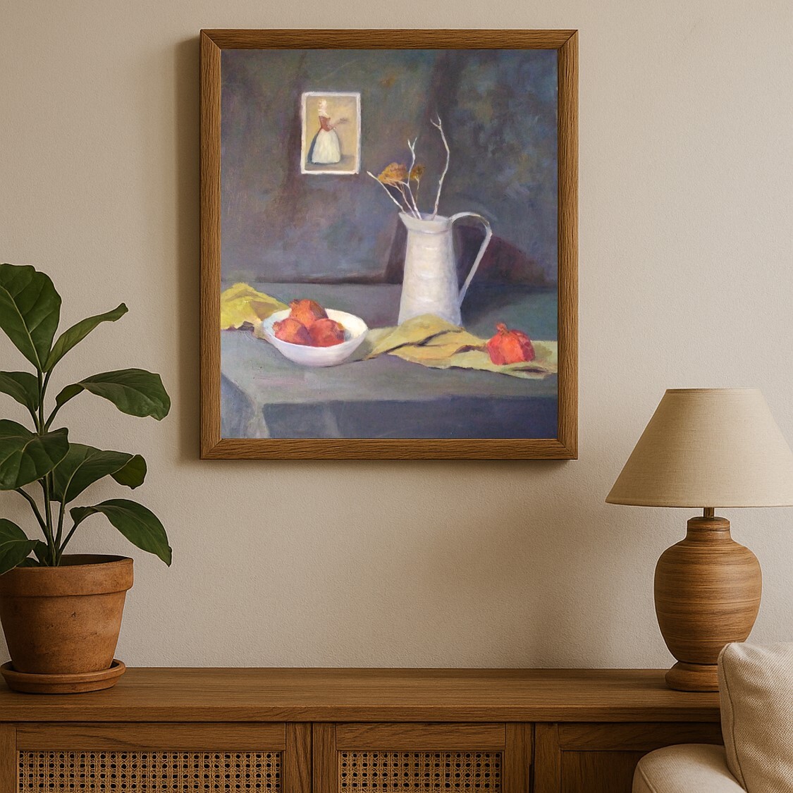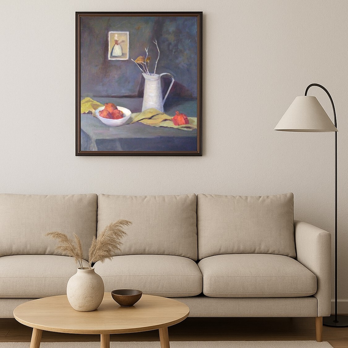 «Этюд в серых тонах» (60 × 50 см) — это камерный натюрморт, выполненный в мягкой, сдержанной палитре. В ней словно визуальная музыка, где каждый предмет — это нота: белый кувшин с сухими ветвями, чаша с гранатами, светлая ткань, портрет на стене. Тонкая игра серых, охристых и красноватых оттенков создаёт ощущение внутреннего покоя, тишины, уединения. Здесь нет избыточных деталей — только настроение, которое растворяется между формами и светом. Эта работа — о том, как красота проявляется в простом, а настоящее искусство рождается из внимательного взгляда на обыденное. Написана в 2024 г. в мастерской МГАХИ им. В.И. Сурикова Картина хорошо впишется в современный интерьер — как в минималистичный, так и в классический. Её мягкая цветовая гамма не спорит с пространством, а акценты (гранаты, ткань) придают живость. Она может стать «островком покоя» в доме или офисе: не кричащая, не требует к себе постоянного внимания, но создаёт ощущение вдумчивого, глубокого пространства.